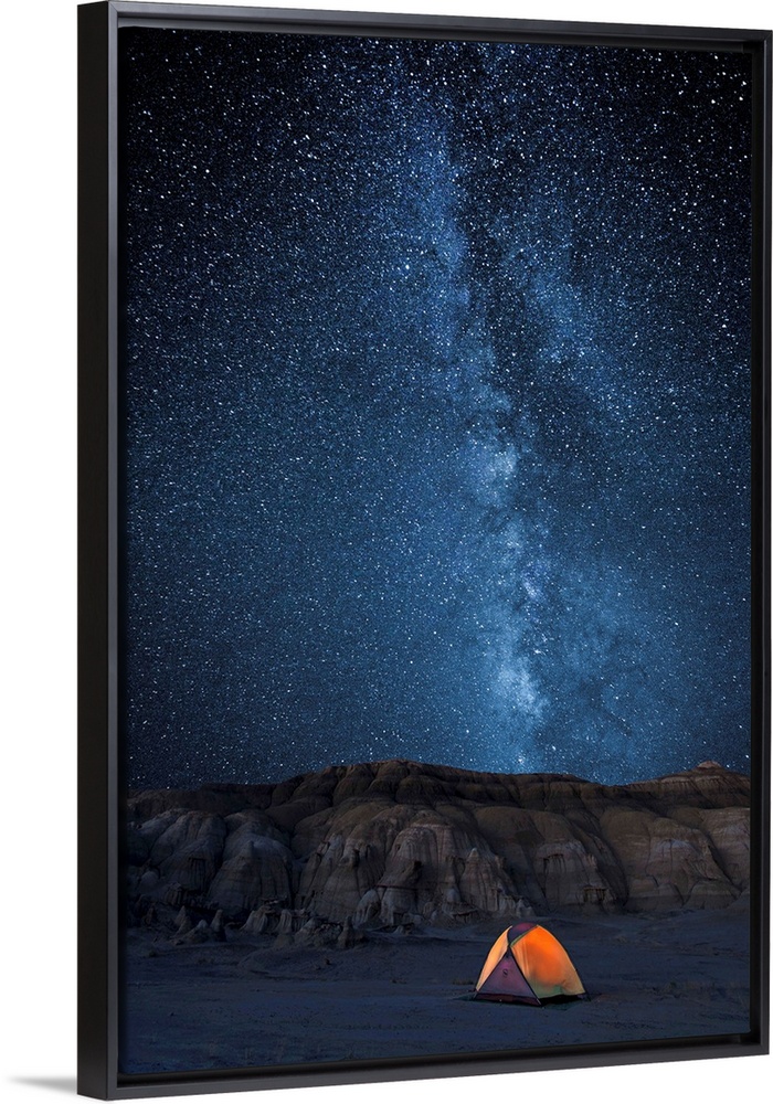 <p>A yellow tent glowing the darkness of night, under a starry sky.</p>