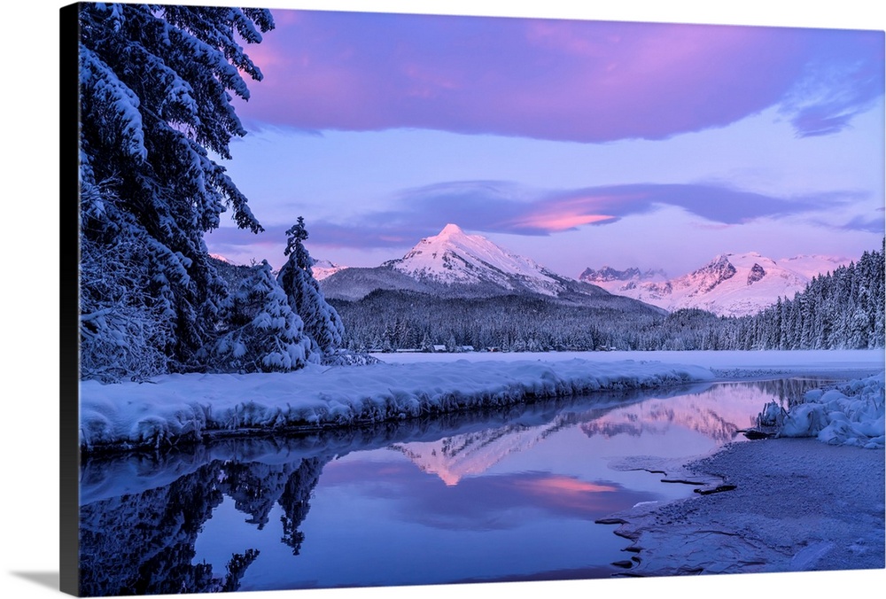 <p>Alpenglow colours the snow-covered coastal range mountains, Mendenhall Glacier and Mendenhall towers are reflected in the open water along the edge of Auke Lake as the sun gets ready to set; Alaska, United States of America.</p>