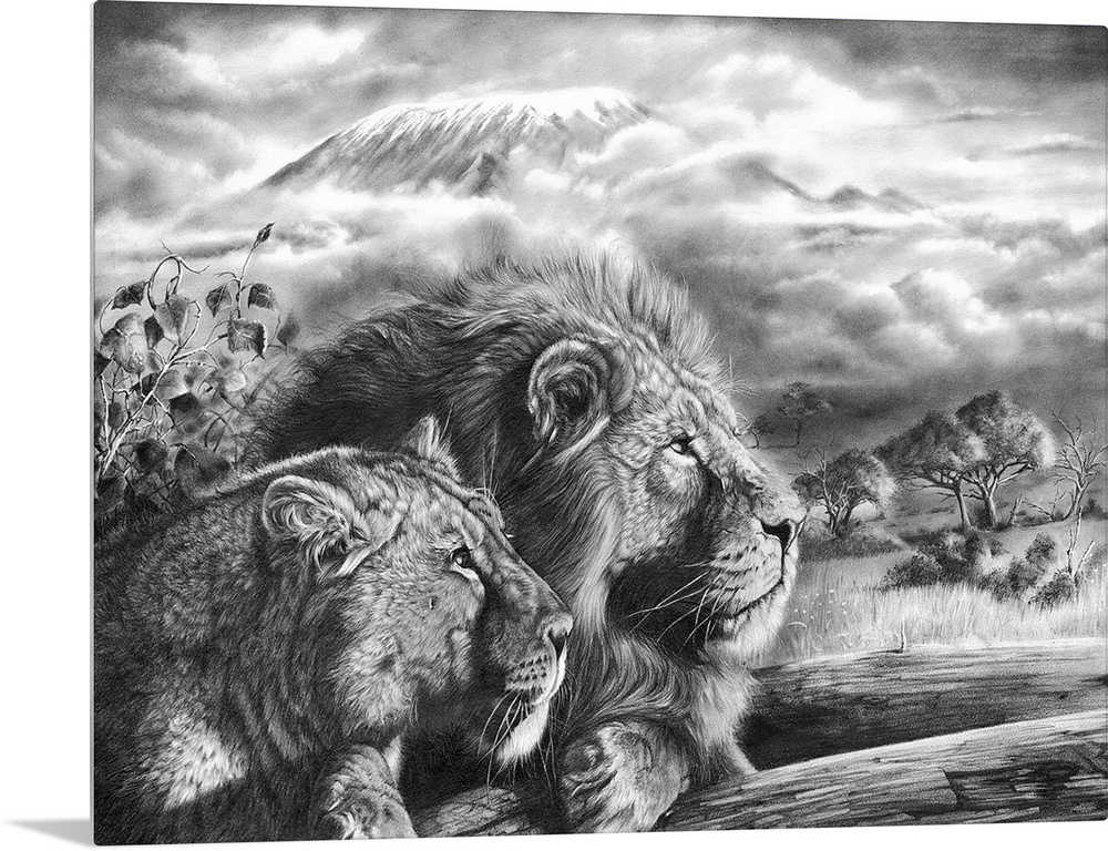 <p>'The Snows of Kilimanjaro' is a graphite pencil drawing on paper. A highly detailed artwork featuring a pair of adult lions resting with the majestic, snow capped, Mount Kilimanjaro peeking through the clouds in the background.</p>