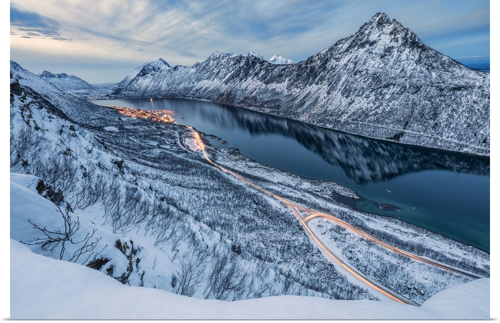 <p>The snowy peaks above the frozen sea framed by the blue lights of dusk, Gryllefjorden, Senja, Troms County, Arctic, Norway, Scandinavia, Europe</p>
