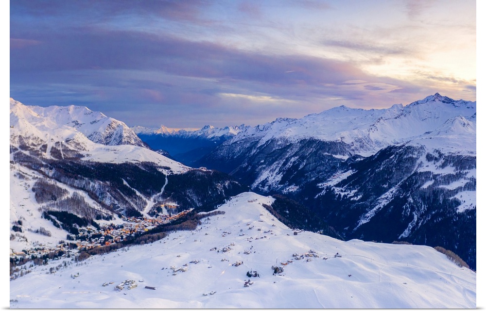<p>Aerial view by drone of sunset on the snowy peaks surrounding Madesimo and Andossi, Valchiavenna, Valtellina, Lombardy, Italy, Europe</p>