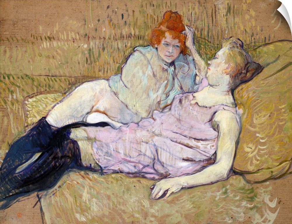 <p>Lautrec set out to document the lives of prostitutes in a series of pictures executed between 1892 and 1896. At first he made sketches in brothels, but he was apparently hampered by insufficient lighting and had his models pose in his studio. He appreciated the naturalness of sitters like this lesbian couple, who stretch themselves out on the divans, entirely without pretensions. The candid image may take its cue from Degas's monotypes of brothel scenes and erotic Japanese prints.</p>