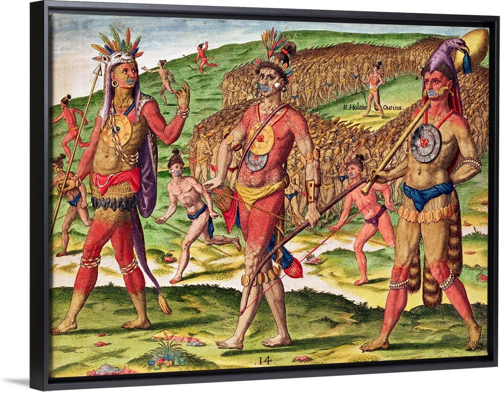 <p>XIR210443 The Soldiers of Outina Marching to Cut their Enemies into Pieces, from 'Brevis Narratio..', engraved by Theodore de Bry (1528-98) 1563 (coloured engraving) by Le Moyne, Jacques (de Morgues) (1533-88) (after); Service Historique de la Marine, Vincennes, France; (add.info.: les saldats d'Outina en marche pour tailler en piece les ennemis;); Giraudon; French, out of copyright</p>