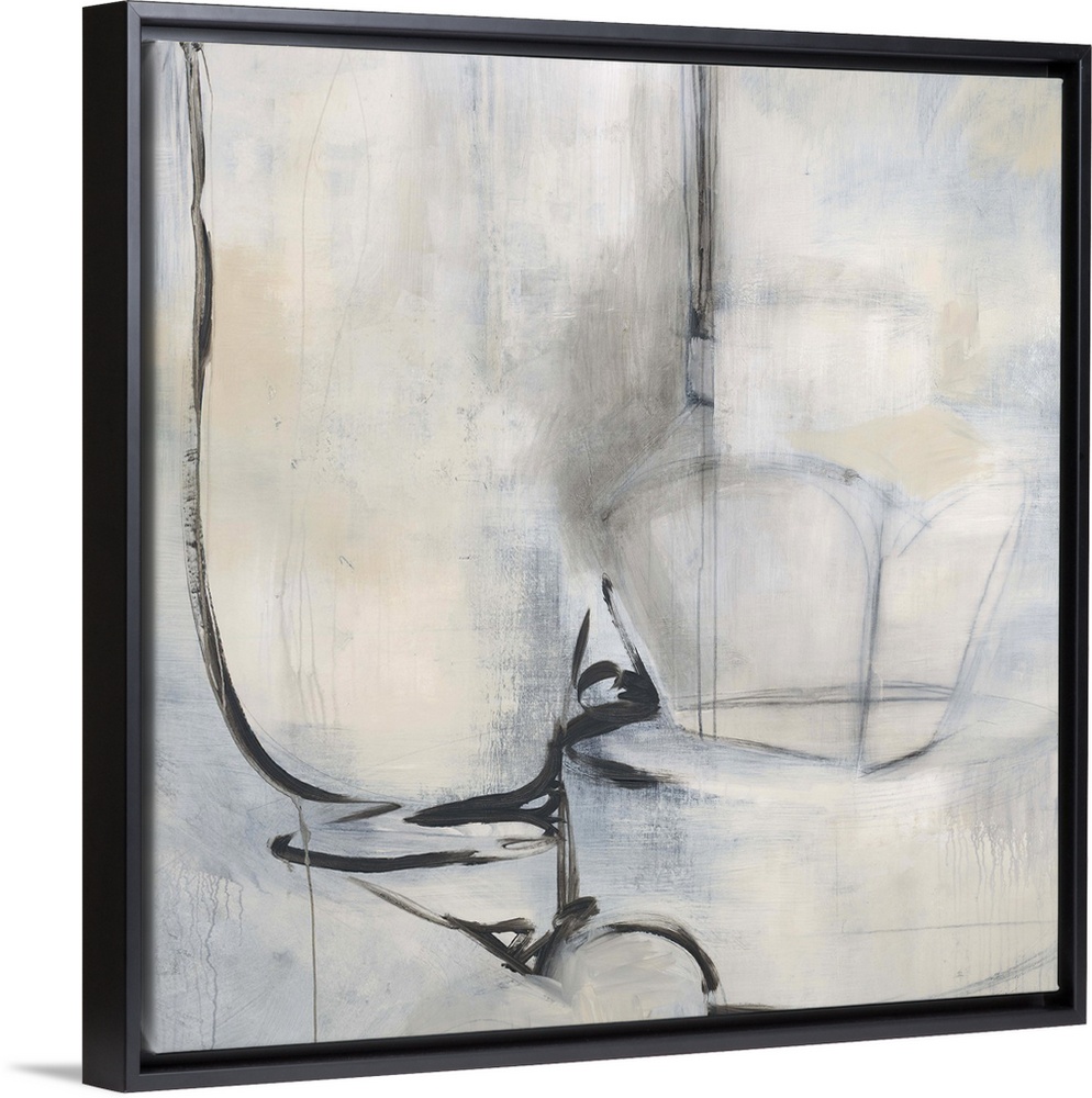 <p>Calm, neutral abstract painting in shades of grey with black strokes.</p>