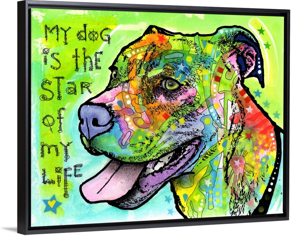 <p>Contemporary stencil painting of a pit bull filled with various colors and patterns with text, "My dog is the star of my life."</p>