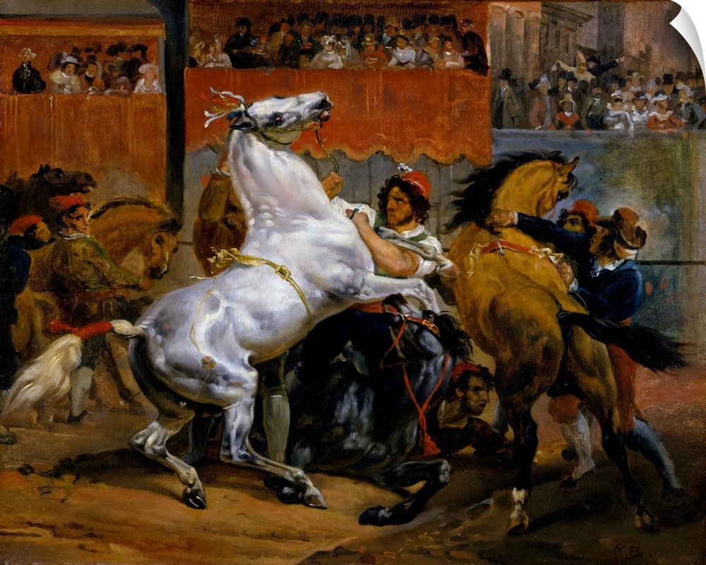 <p>Races of riderless horses were a highlight of Rome's Carnival, held each February before Lent. Vernet's painting depicts grooms struggling to restrain the horses before the start of the race-la mossa-in the Piazza del Popolo, which Goethe called one of the finest sights that can be seen anywhere in the world. Vernet was certainly aware of his friend Gericault's studies of the race when he made this one, which served a preparatory role for a larger composition acquired by the French Ambassador to Rome (now private collection).</p>
