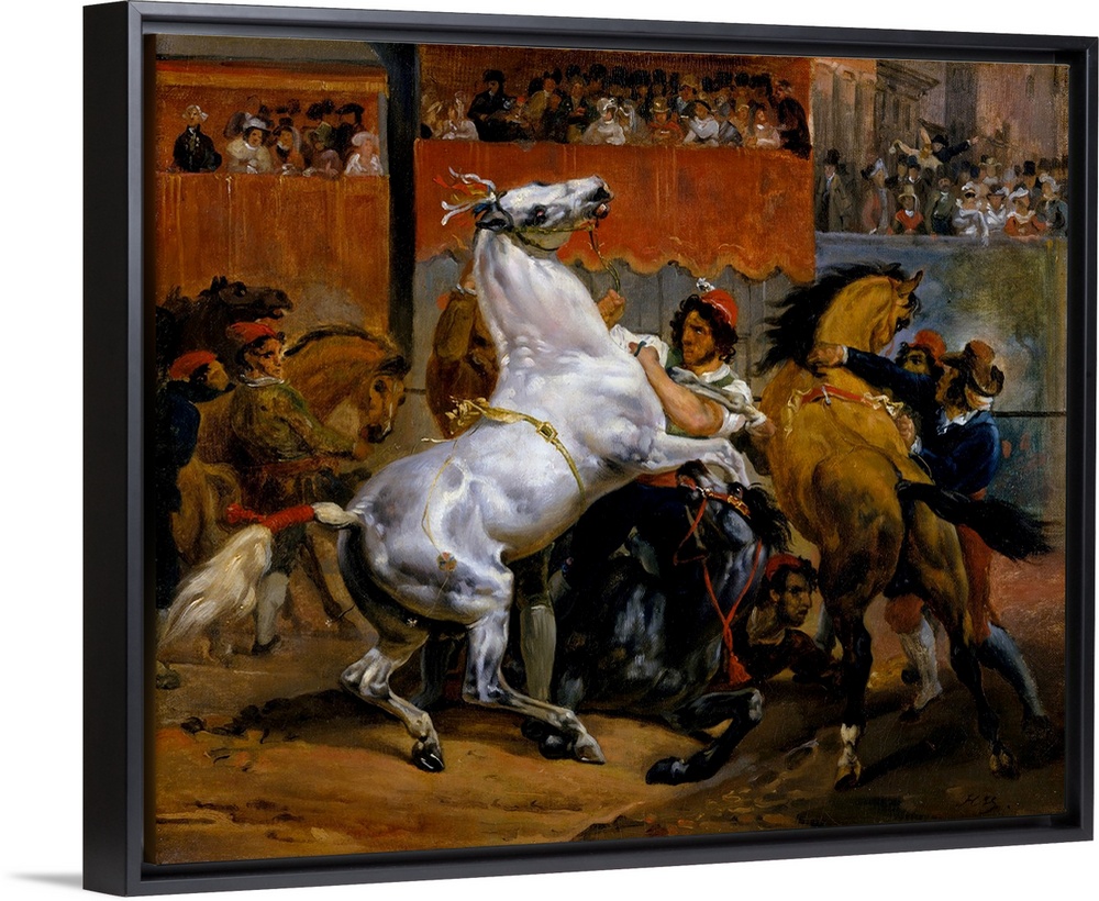 <p>Races of riderless horses were a highlight of Rome's Carnival, held each February before Lent. Vernet's painting depicts grooms struggling to restrain the horses before the start of the race-la mossa-in the Piazza del Popolo, which Goethe called one of the finest sights that can be seen anywhere in the world. Vernet was certainly aware of his friend Gericault's studies of the race when he made this one, which served a preparatory role for a larger composition acquired by the French Ambassador to Rome (now private collection).</p>