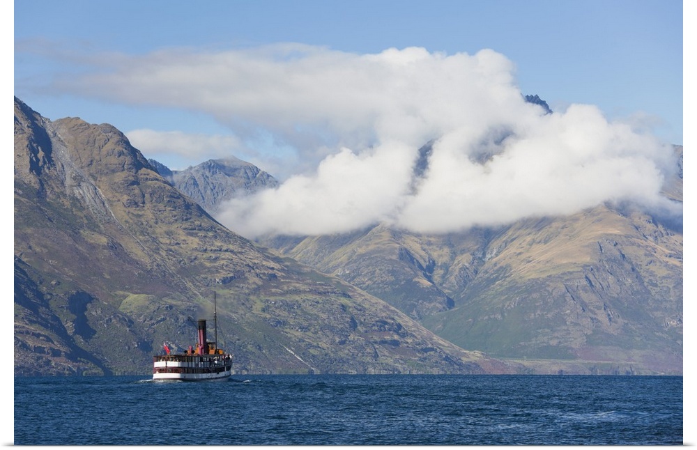 <p>The steamship TSS Earnslaw on Lake Wakatipu, clouds over Walter Peak, Queenstown, Queenstown-Lakes district, Otago, South Island, New Zealand, Pacific</p>
