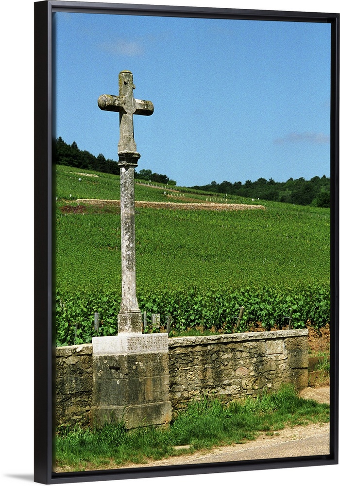 <p>The stone cross marking the Romanee Conti and Richebourg vineyards of Domaine de la Romanee Conti in Vosne Romanee, Bourgogne</p>