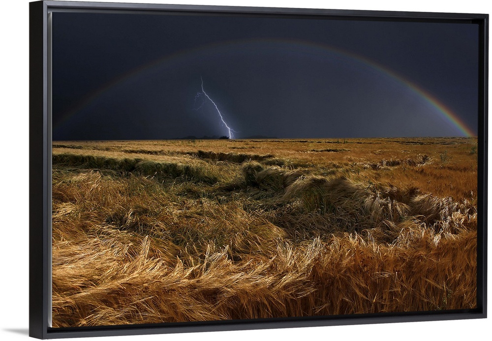 <p>Field after storm with a rainbow in the dark sky and one final bolt of lightning.</p>