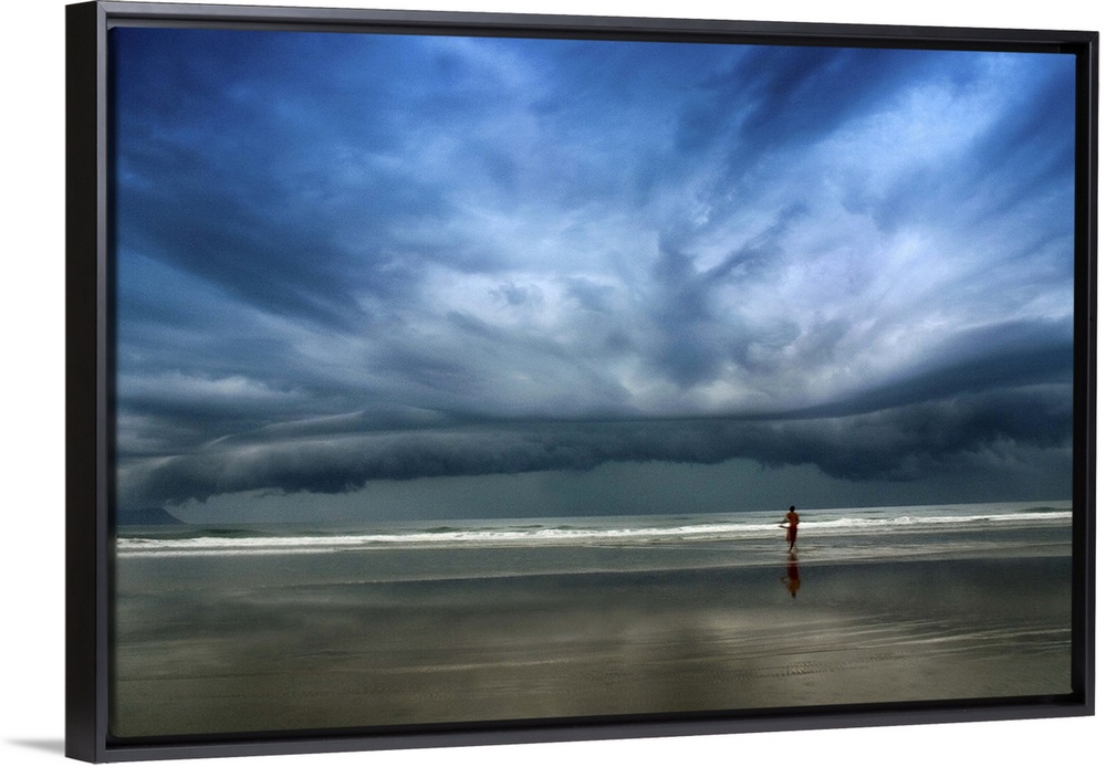 <p>Adventurous surfer heads into the water, undeterred by the approaching stormclouds.</p>