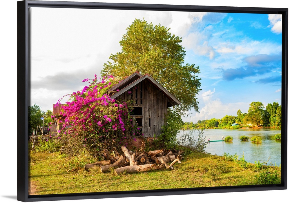 <p>A hut with a bougainvillea in an Asian landscape</p>