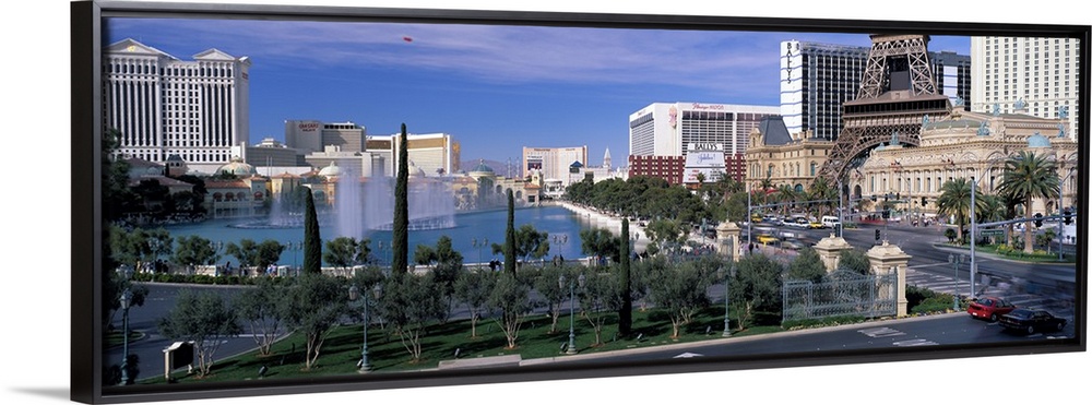 <p>A panorama of the Las Vegas Strip in Nevada, spanning the Bellagio Fountains and the replica Eiffel Tower, as well as several other casinos.</p>