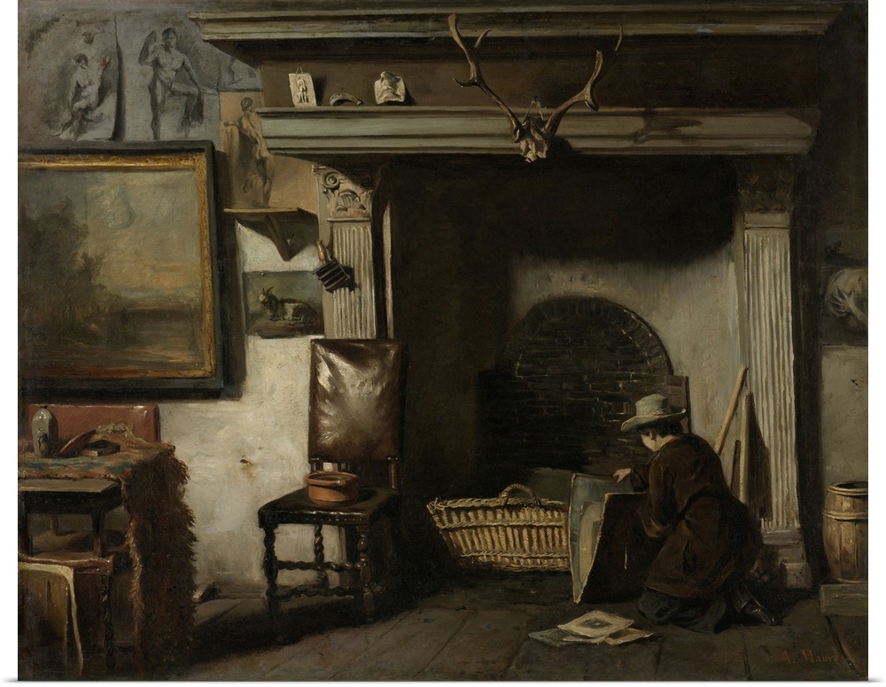 <p>The Studio of the Haarlem Painter Pieter Frederik van Os, by Anton Mauve, c. 1856-57, Dutch painting, oil on canvas. Artist studio in the Town Hall of Haarlem with student kneeling at a large 17th-century fireplace.</p>