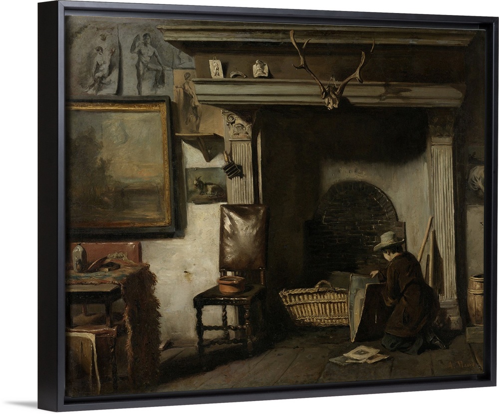<p>The Studio of the Haarlem Painter Pieter Frederik van Os, by Anton Mauve, c. 1856-57, Dutch painting, oil on canvas. Artist studio in the Town Hall of Haarlem with student kneeling at a large 17th-century fireplace.</p>