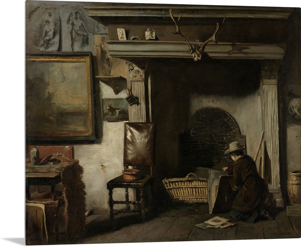 <p>The Studio of the Haarlem Painter Pieter Frederik van Os, by Anton Mauve, c. 1856-57, Dutch painting, oil on canvas. Artist studio in the Town Hall of Haarlem with student kneeling at a large 17th-century fireplace.</p>