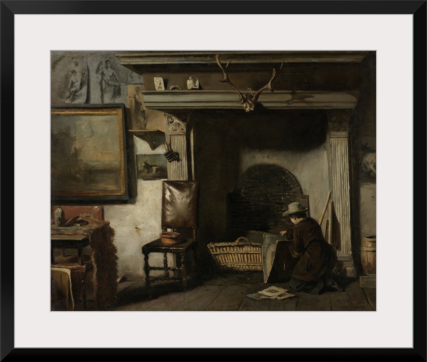 <p>The Studio of the Haarlem Painter Pieter Frederik van Os, by Anton Mauve, c. 1856-57, Dutch painting, oil on canvas. Artist studio in the Town Hall of Haarlem with student kneeling at a large 17th-century fireplace.</p>