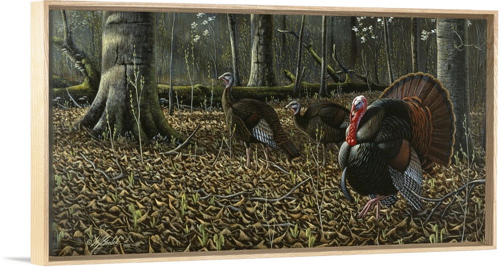 <p>Wild turkeys walking through the forest.</p>