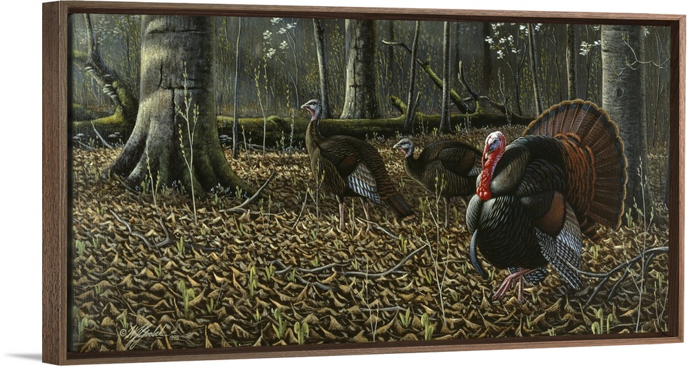 <p>Wild turkeys walking through the forest.</p>