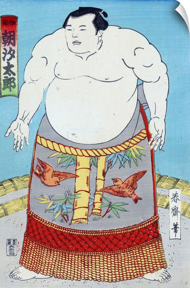 <p>Colour woodcut of a print of The Sumo wrestler Asashio Taro. It shows a fulllength portrait, standing, facing slightly left, wearing waist wrap with birds and bamboo motif.</p>