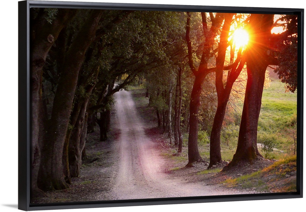 <p>A large piece of artwork with the sun shining through the tops of trees that are next to a gravel road and a field.</p>