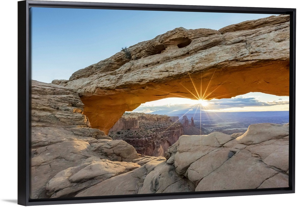 <p>The sun is rising under Mesa Arch, Canyonlands National Park, Moab, Utah, United States of America, North America</p>