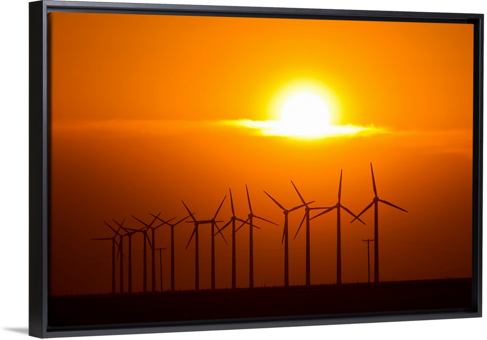<p>The sun sets behind a row of spinning windmills or wind turbines.</p>
