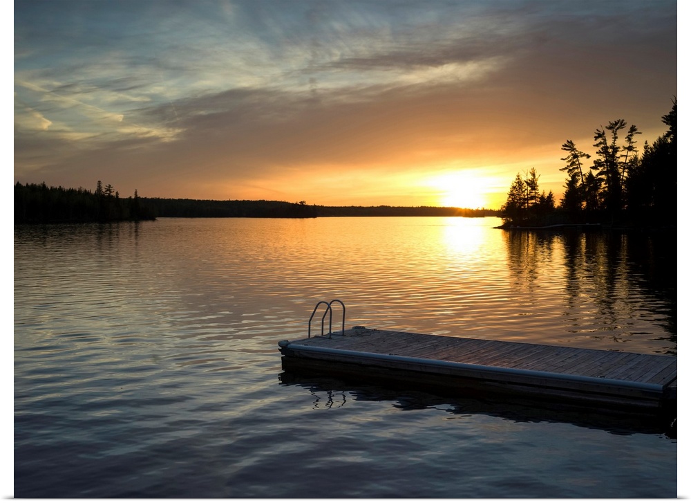 <p>The sun setting over a tranquil lake and silhouetted trees along the shoreline with a dock and ladder in the foreground; Lake of the Woods, Ontario, Canada</p>