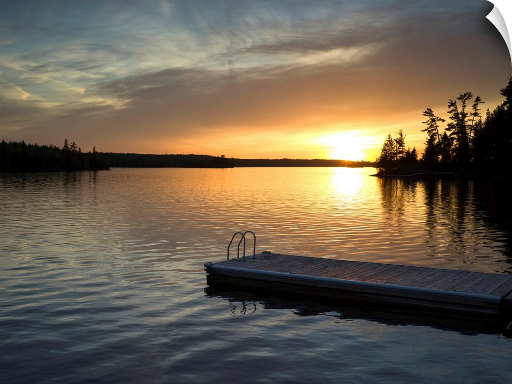 <p>The sun setting over a tranquil lake and silhouetted trees along the shoreline with a dock and ladder in the foreground; Lake of the Woods, Ontario, Canada</p>