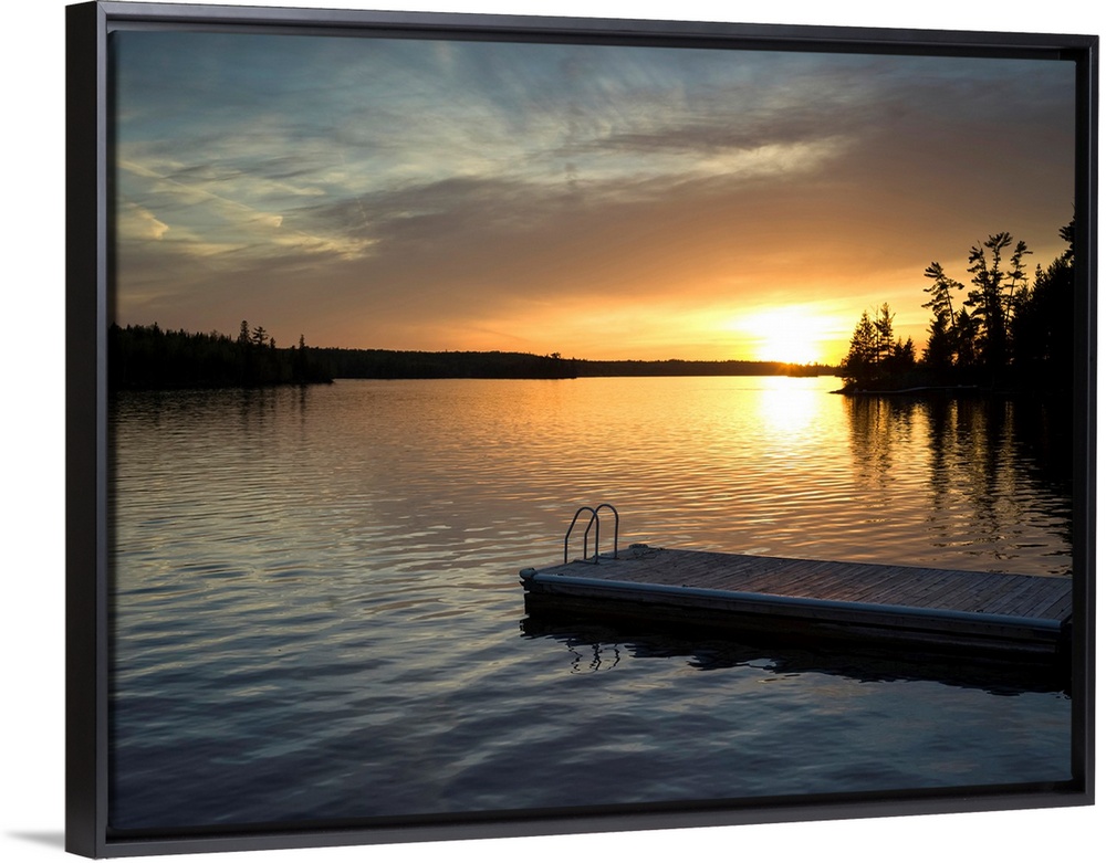 <p>The sun setting over a tranquil lake and silhouetted trees along the shoreline with a dock and ladder in the foreground; Lake of the Woods, Ontario, Canada</p>