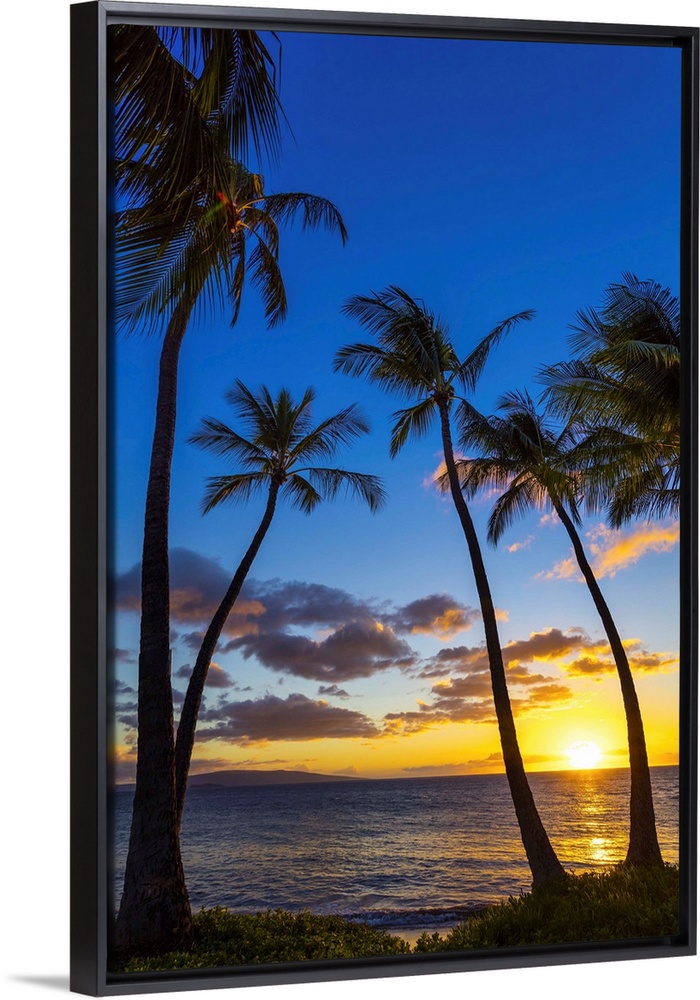 <p>The sun setting through silhouetted palm trees; Wailea, Maui, Hawaii, United States of America</p>