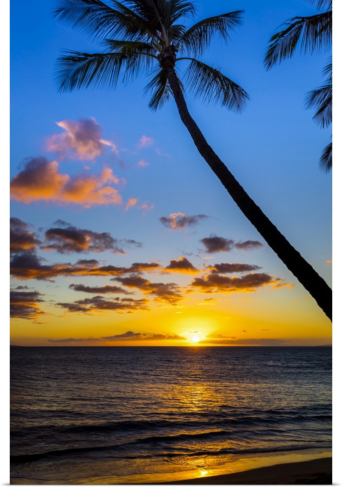 <p>The sun setting through silhouetted palm trees; Wailea, Maui, Hawaii, United States of America</p>