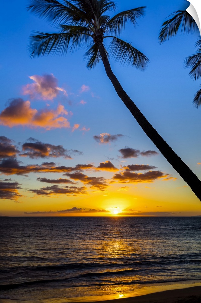 <p>The sun setting through silhouetted palm trees; Wailea, Maui, Hawaii, United States of America</p>