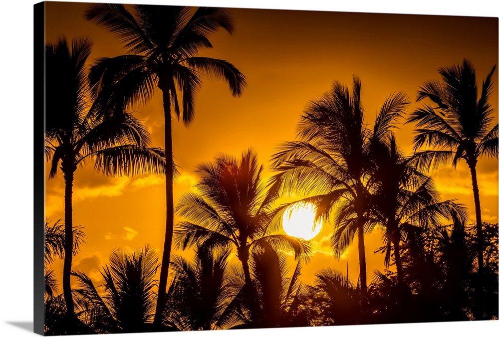 <p>The sun setting through silhouetted palm trees; Wailea, Maui, Hawaii, United States of America.</p>