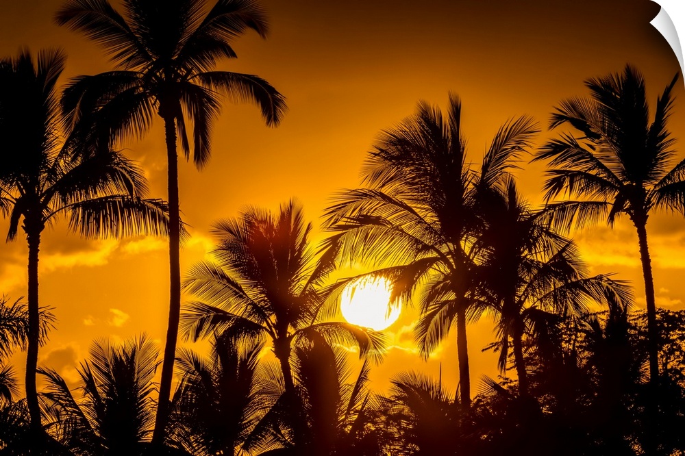<p>The sun setting through silhouetted palm trees; Wailea, Maui, Hawaii, United States of America.</p>