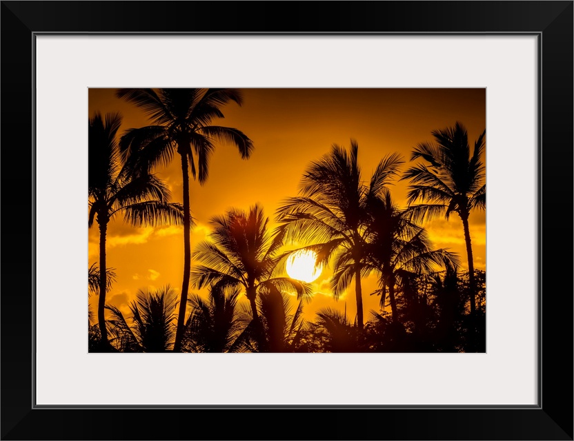 <p>The sun setting through silhouetted palm trees; Wailea, Maui, Hawaii, United States of America.</p>