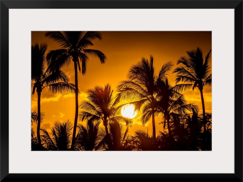 <p>The sun setting through silhouetted palm trees; Wailea, Maui, Hawaii, United States of America.</p>