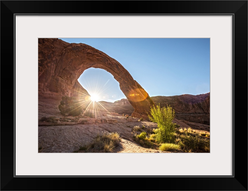 <p>The sun peeking behind the Corona Arch illuminating the desert grasses in Arches National Park, Utah.</p>