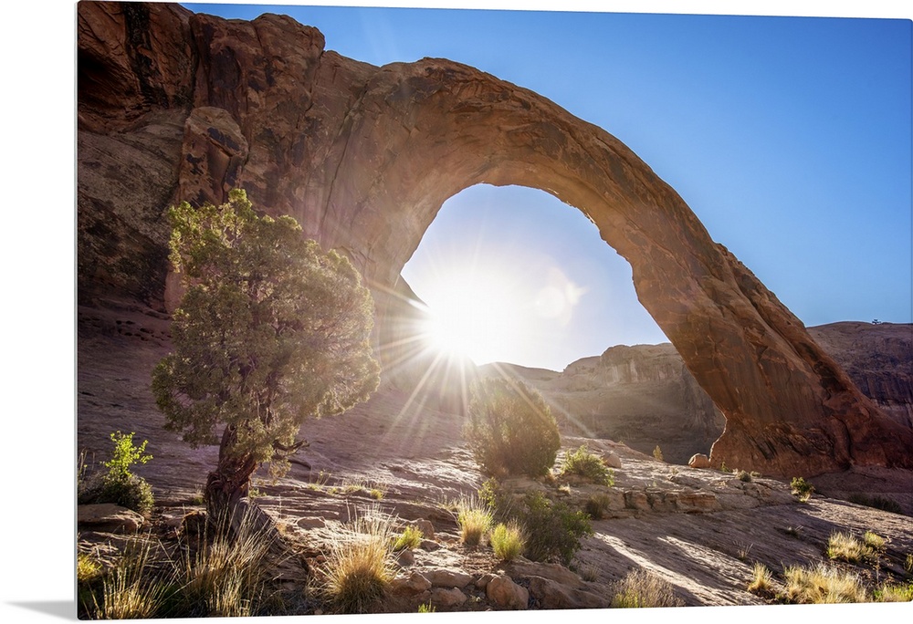 <p>The sun peeking behind the Corona Arch illuminating the desert grasses in Arches National Park, Utah.</p>