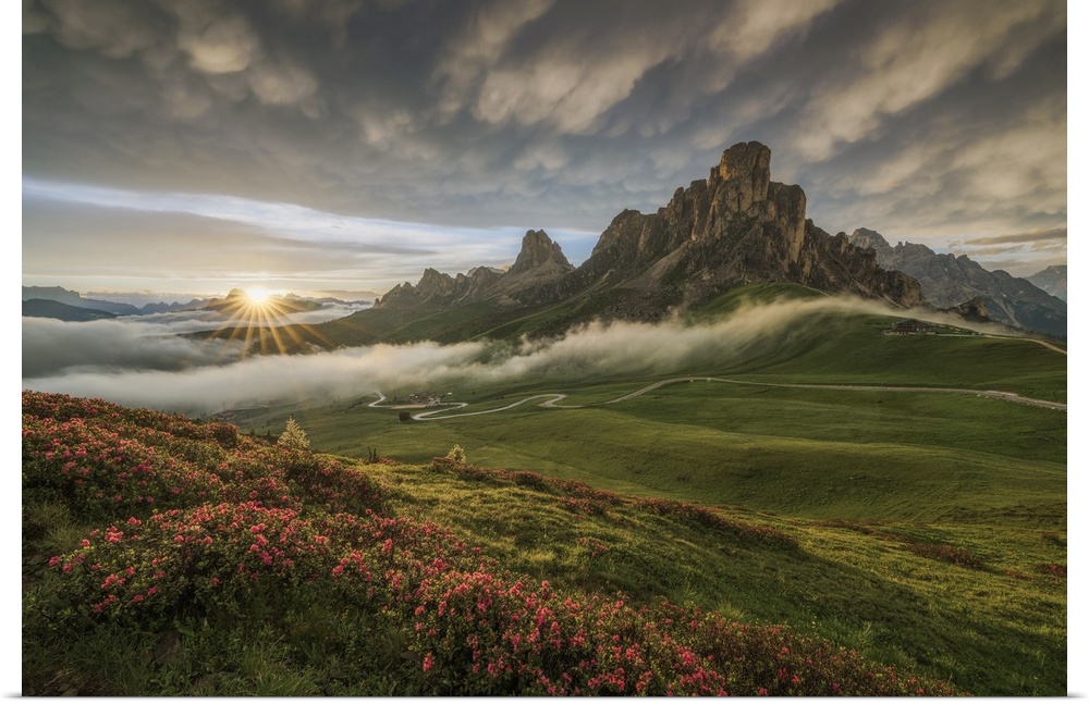<p>The sunset in front of Ra Gusela, Averau, Nuvolau and Passo Giau in Dolomiti Bellunesi, Unesco Heritage, Veneto, Belluno, Italy.</p>