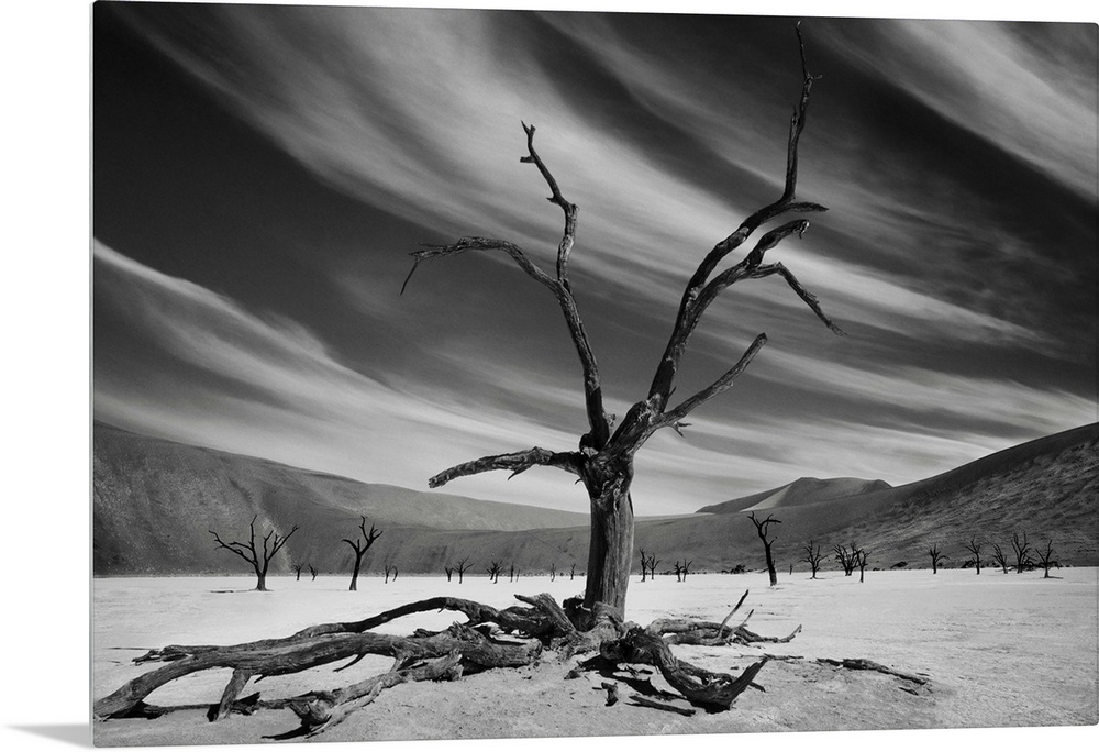 <p>Dead trees stands in an arid desert landscape, Namibia.</p>