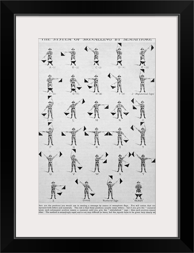 <p>Illustration depicting the system of signalling by flag semaphore the telegraphy system, which conveys information at a distance by means of visual signals with handheld flags. Dated 19th Century.</p>