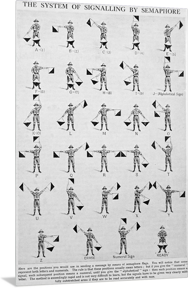<p>Illustration depicting the system of signalling by flag semaphore the telegraphy system, which conveys information at a distance by means of visual signals with handheld flags. Dated 19th Century.</p>