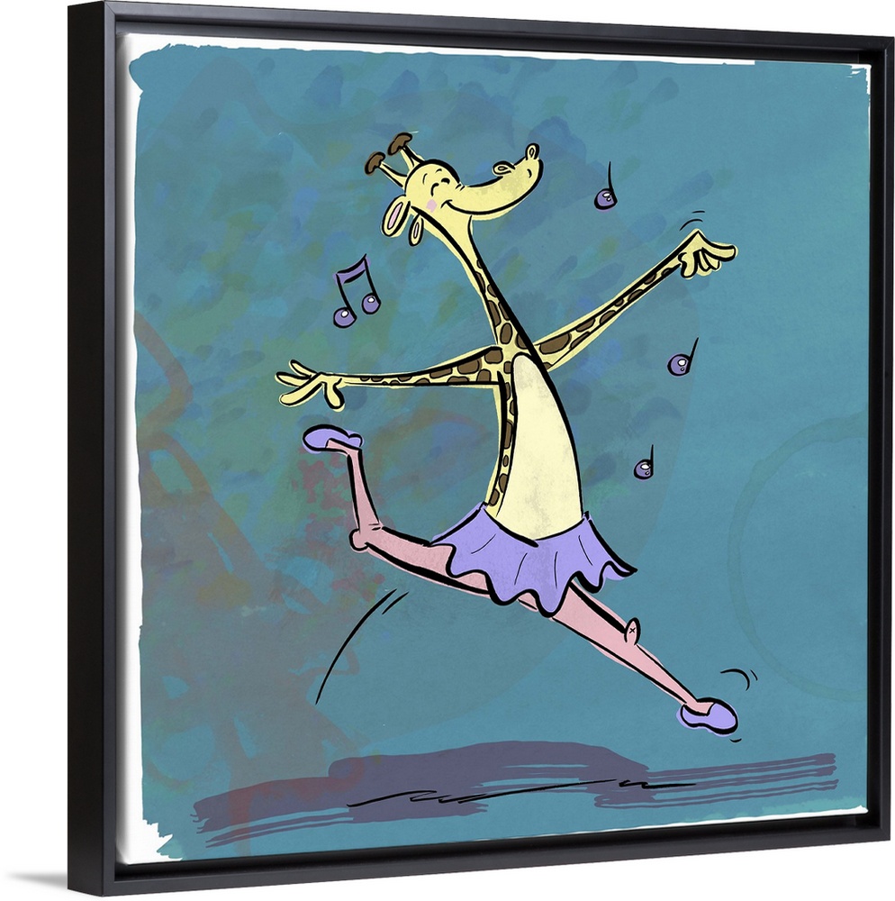 <p>Fun cartoon artwork of a ballerina giraffe leaping with music.</p>