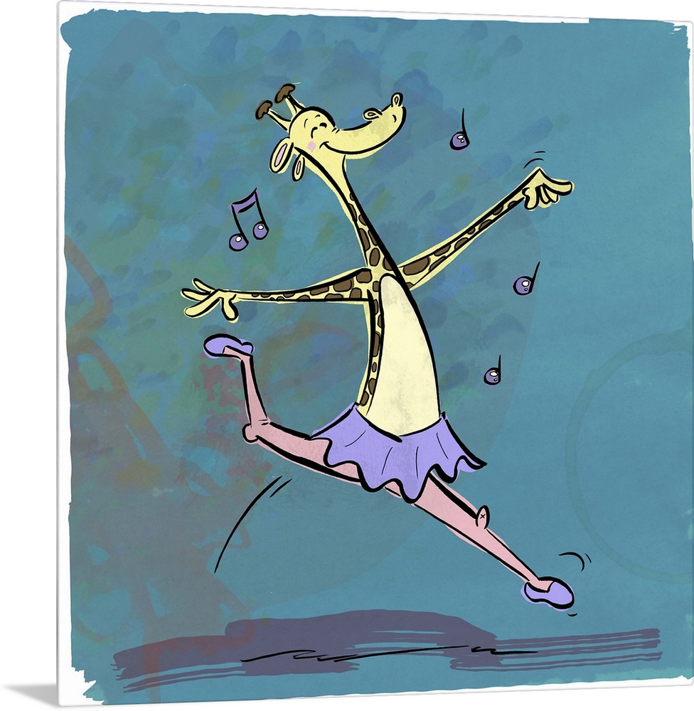 <p>Fun cartoon artwork of a ballerina giraffe leaping with music.</p>