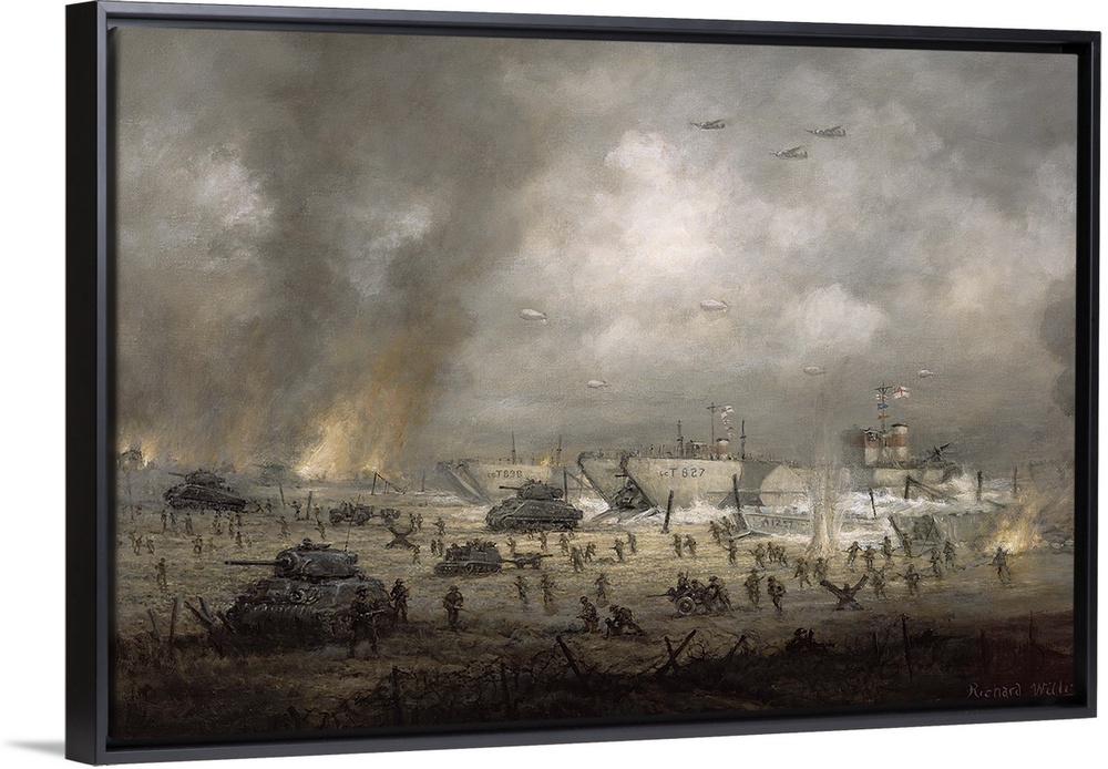 <p>This large piece is a drawing and depiction of war with soldiers and tanks on the ground as ships come in from the water.</p>