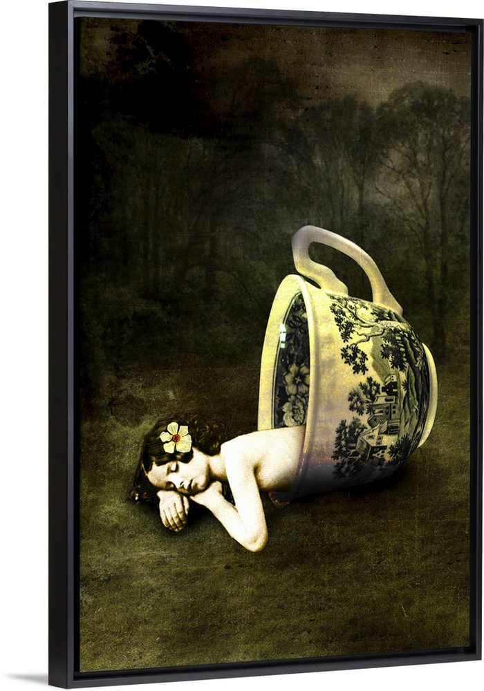<p>A small girl sleeping in a large teacup in a forest.</p>