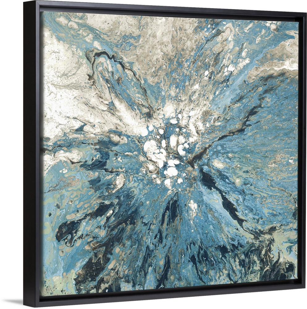 <p>Square abstract painting using shades of blue, gray, and white all forming together at a central point in the middle.</p>