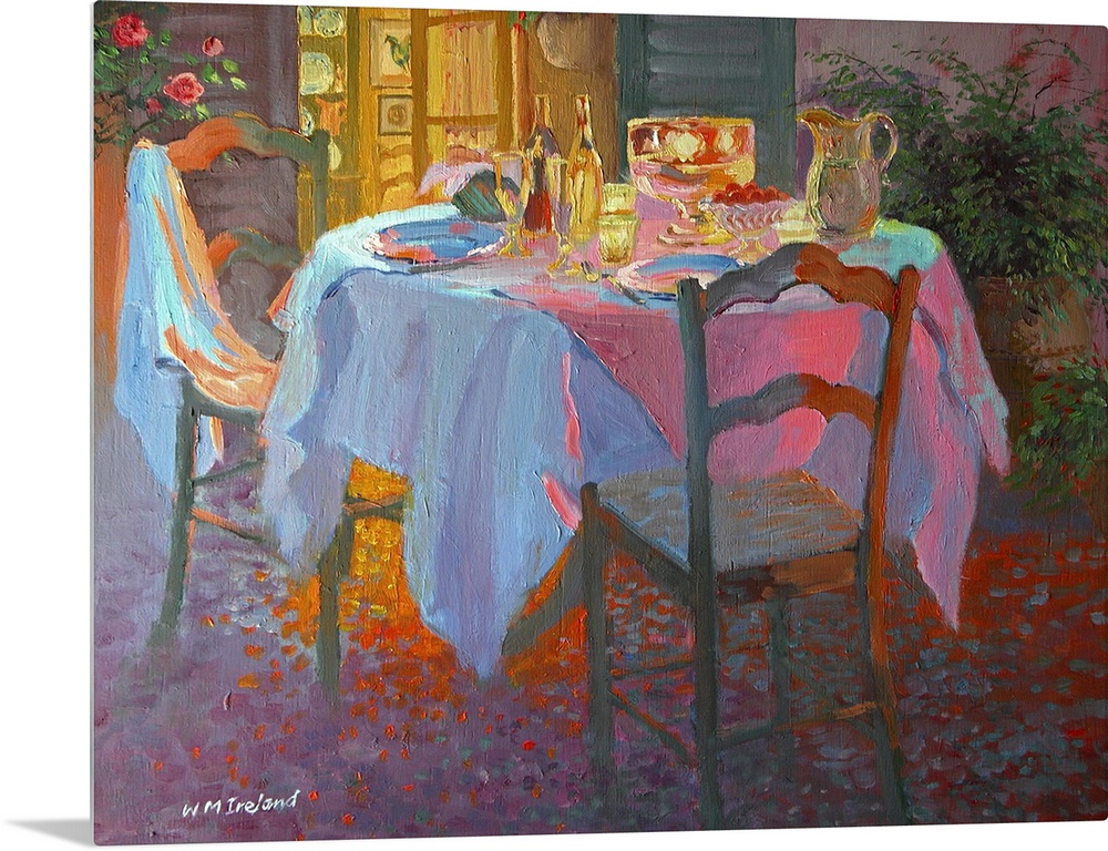 <p>Contemporary artwork of an outdoor table scape for two people during the evening.</p>
