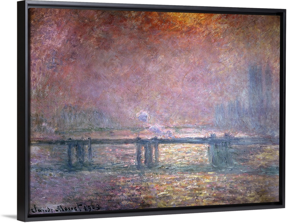 <p>Claude Monet's famous impressionalist painting of a bridge stretching across the Thames in England. Painting is dominated by vibrant tones.</p>